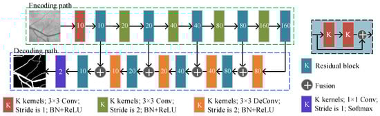 Our custom basic FCN implementation has an overall architecture similar to a standard FCN [30], as shown in Figure 5. Basic FCN include encoders and decoders symmetrically up and down the architecture. The encoding path is used to encode lower-dimensional input images with richer filters, capturing semantic/contextual information. The decoding path is designed to perform the inverse of the encoding and restore the spatial information by upsampling and fusion the low-dimensional features, which makes it possible to locate accurately. The difference between our custom basic FCN and the standard FCN is that we use the residual block [29] instead of one convolution layer. The shortcut connection in the residual block avoids the gradient disappearance problem of the CNN because the gradient of the residual block is always greater than or equal to 1 in back-propagation. Before each convolution layer, we use the batch normalization layer [23] to normalize the features so that they have a mean of 0 and a variance of 1. Using the BN layer can greatly improve the training speed and improve the stability and generalization of the model [23].