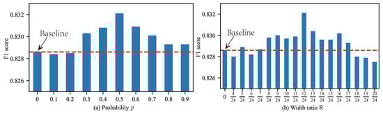 When implementing RCF on FCN training, we have three hyper-parameters to evaluate, i.e., the probability p, the width ratio R, and the filling method. To demonstrate the impact of these hyper-parameters on the model performance, we conduct experiments on DRIVE based on M3FCN under varying hyper-parameter settings. When evaluating one of the parameters, we fixed the other two parameters. The results are shown in Figure 7 and Table 2. In the experiments, we used data augmentation to compare the performance of the RCF method under different parameters. In particular, when or , it means using data augmentation but not using RCF and using this as our baseline. It can be seen from Figure 7 and Table 2 that, when , , and the filling method is RCF-A, M3FCN reaches the highest F1 score of 0.8321. Specifically, our best result increased the F1 score by 0.33% compared with the baseline. In the following experiment, we set , , and the filling method is RCF-A.