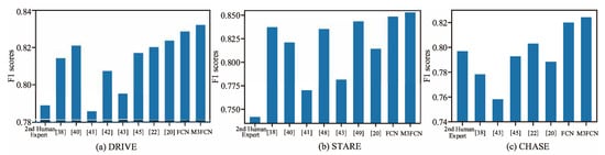 Table 5, Table 6 and Table 7 compare the proposed method with several other state-of-the-art methods on the DRIVE, STARE, and CHASE datasets, respectively. Figure 8 visualizes the F1 scores for different methods. We observed that the M3FCN achieved the highest F1 score, indicating that it can more accurately segment the background and blood vessels. The F1 score is a judgment indicator of comprehensive recall and precision, and our approach has a better balance. M3FCN achieved the highest sensitivity, which indicates that it can correctly label more vessel pixels. Vascular pixels typically only account for 10% of all pixels in the image. The unbalanced category makes it more difficult to train a classifier for segmenting retinal blood vessels. Therefore, the high sensitivity obtained by our method is very important, and the computer-aided diagnosis system needs to detect blood vessels without adding false cases. At the same time, the M3FCN achieves the highest accuracy, indicating that it can better classify the background and blood vessels, which is not achieved by increasing the number of false positives and false negatives.