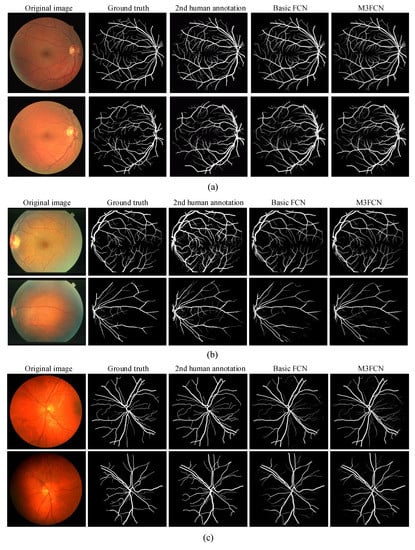 Compared to the basic FCN with M3FCN, M3FCN mainly has the following improvements: (1) adding multi-scale input modules; (2) expanding to multi-path FCN; and (3) using multi-output fusion to obtain final segmentation results. In order to analyze the effects of these improvements, we performed an ablation experiment: comparing improved and non-improved FCN performance based on equal experimental setups. We evaluated the model using the DRIVE test data. F1 score, Accuracy, Sensitivity, Specificity, and AUC were shown in Table 4. It can be concluded from Table 4 that the performance of M3FCN is better than other improved models. The global F1 score for basic FCN and M3FCN is 0.8279/0.8321 on DRIVE. According to Table 4, we can draw the following experimental summary: (1) M3FCN performs better than other improved models; (2) the performances with multi-path FCN are better than non-multipath FCN, which indicates that multi-path structure has better feature extraction and noise reduction; (3) multi-scale input or multi-output fusion combined with multi-path FCN has a large performance improvement. The three improvements of multi-scale input, multi-path, and multi-output fusion have an impact on the performance of the model and can achieve optimal results after combination.