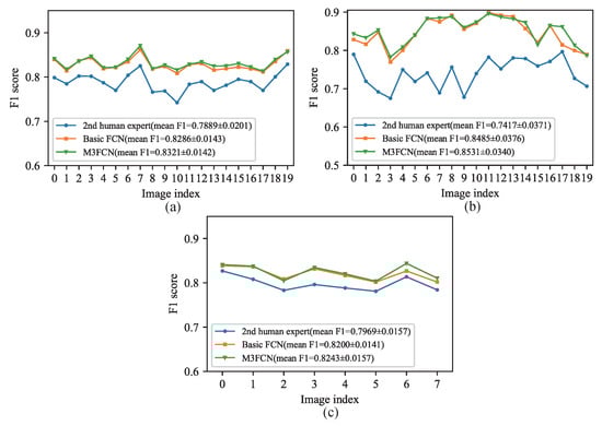 Visualizations of the segmented vessel probability map of M3FCN for all three datasets are shown in Figure 9. In Figure 10, we visualize the results of the F1 score for each test image in the DRIVE, STARE, and CHASE datasets to further observe the segmentation results. From the segmentation results, the M3FCN is better than the basic FCN and the 2nd human expert. It can be seen from the mean and standard deviation that the segmentation result of M3FCN is more accurate and stable than the results of basic FCN and second human expert segmentation. This indicates that the M3FCN is highly generalized, has a strong ability to extract and recognize features, and can well segment the blood vessels of various retinal images. Whether in healthy or diseased retinal images, M3FCN can maintain a relatively stable segmentation effect, which can overcome the impact of lesions well.