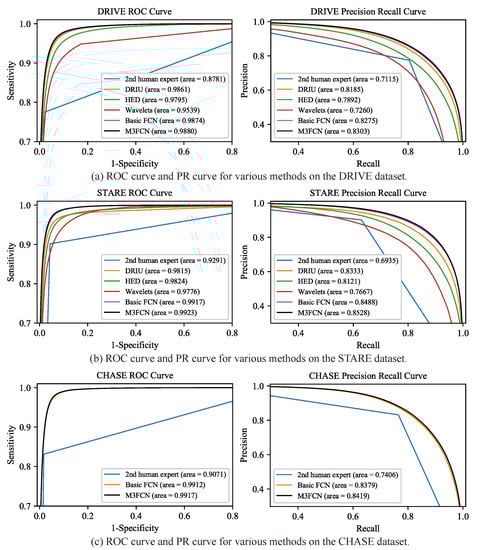 In Figure 11, the Receiver Operating Characteristic (ROC) curve and Precision Recall (PR) curve are computed and visualized and compared with other several state-of-the-art methods such as DRIU [40], Wavelet [53], HED [54]. The ROC curve gives information between the false positive pixel and the true positive pixel in the form of a fraction based on the threshold change on the probability map. The PR curve can better reflect the true performance of the classification when the ratio of positive and negative samples is large. The difference from the upper left convex of the ROC curve is that the PR curve is the upper right convex effect. The ROC and PR curve area on the M3FCN is 0.19% and 1.18% higher than DRIU [40], respectively. We also visualized the curve of the 2nd human expert segmentation results, and the ROC and PR curve area were 0.8781 and 0.7115, respectively. The results show that M3FCN can achieve better segmentation results than the 2nd human expert. On the STARE and CHASE datasets, we can get the same conclusions as to the DRIVE dataset. The M3FCN obtains the best performances on the DRIVE dataset (0.9880 , 0.8303 ), the STARE dataset (0.9923 , 0.8528 ) and the CHASE dataset (0.9917 , 0.8419 ). It can be observed that the curve of the proposed methods is increasing at the true positive rate that indicates better performance of the proposed method than all other existing methods. Compared with other methods, M3FCN can extract deeper representation features, better segment background information and fine vascular information.