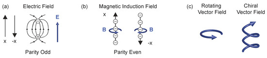 Illustration of parity symmetry for an electric field () arising between positive and negative point charges (a) and the magnetic induction field () arising from a steady state current (b). (c) Illustration of the distinction between a rotating vector field and a chiral vector field, where rotational motion has a component along the axis of rotation.