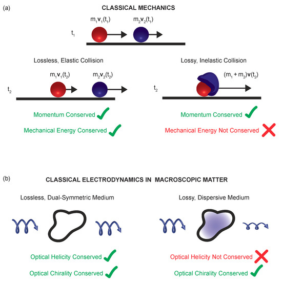 Thus, revisiting the case of an elastic and inelastic collision in classical mechanics (Figure 2), we draw a qualitative comparison to the physical relevance of optical helicity and optical chirality in the presence of matter. From Noether’s theorem, the conservation of linear momentum in a lossless system arises from translational invariance [50,56] and, as Figure 2 demonstrates, the conservation of linear momentum captures the translational motion of a mechanical collision. Similarly, the conservation of optical helicity, with units of angular momentum, finds its physically relevant application in the description of chiral symmetries of propagating electromagnetic fields in systems where electromagnetic duality symmetry holds. In contrast, just as energy conservation captures the conversion of kinetic energy to heat in the case of an inelastic collision, optical chirality conservation is the suitable conservation law to describe the physical mechanism of optical chirality dissipation in the presence of lossy, dispersive media.