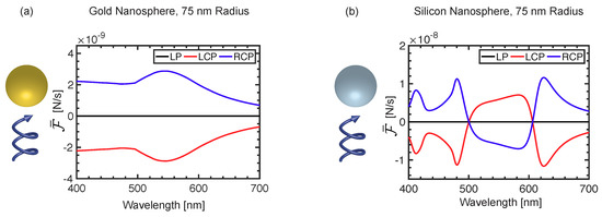 The conservation law of optical chirality (Equation (7)), which sets equal the physical mechanisms of optical chirality dissipation and optical chirality flux can explain the generation of chiral optical fields in Figure 3. In particular, a non-zero optical chirality dissipation arises from the interaction between the achiral nanospheres and the chiral excitation source, leading to the generation of an optical chirality flux. In contrast, prior work has shown that nanostructures with a chiral geometry interacting with achiral, linearly polarized light have the ability to dissipate optical chirality, thus generating an optical chirality flux [66,83,86,96]. Figure 3 also demonstrates that the silicon nanosphere generates an optical chirality flux an order of magnitude larger than the gold nanosphere of the same size.