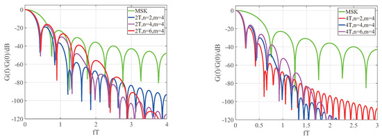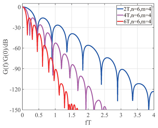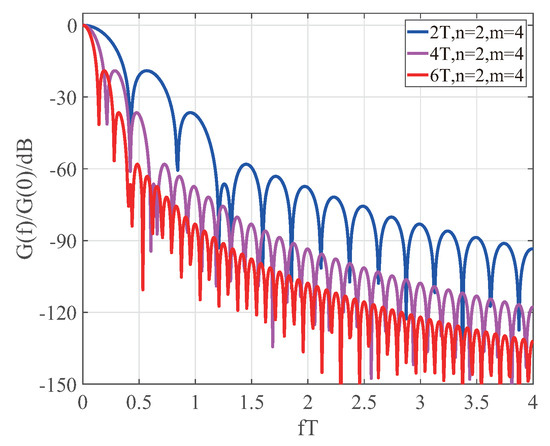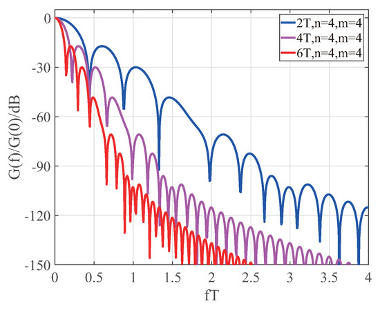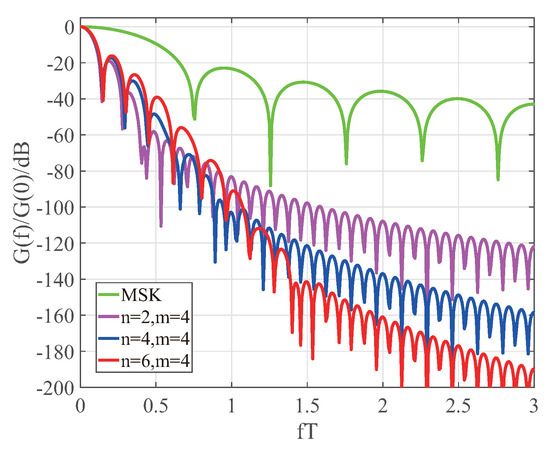 Based on Figure 1, Figure 2 and Figure 3, the main features of the normalized energy spectral densities of CPM signals for different lengths are analyzed. The properties of a Fourier transform state that when a time domain signal is Fourier transformed into a frequency domain signal, the corresponding frequency domain signal will be narrowed as the time domain signal is broadened [21]. For Figure 1, taking 2fT to 3fT as an example, when the length of the CPM function is 2T, there are approximately four side lobes, and when the length of the CPM function is increased to 4T and 6T, there are approximately eight and 12 side lobes respectively for the same 2fT to 3fT interval, corresponding to a direct multiple of the function length in the time domain. When n = 2, m = 4 and the CPM function length is 6T, the band utilization rate is 2.3 times higher than when the CPM function length is 2T and 1.5 times higher than when the CPM function length is 4T, for a −40 dB bandwidth. When n = 4, m = 4 and the CPM function length is 6T, the band utilization rate is 2.1 times higher than when the CPM function length is 2T and 1.5 times higher than when the CPM function length is 4T, for a −40 dB bandwidth. When n = 6, m = 4 and the CPM function length is 6T, the band utilization rate is 2.9 times higher than when the CPM function length is 2T, and 1.5 times higher than when the CPM function length is 4T, for a −40 dB bandwidth. This analysis shows that increased suppression of interference due to the side lobes is required as the baseband symbol signal grows, but the band utilization can also be improved to some extent in the communication system, since the increased length of the baseband symbol signal also speeds up the decay. Therefore, in a practical communication process, an appropriate solution should be selected depending on the actual requirements.