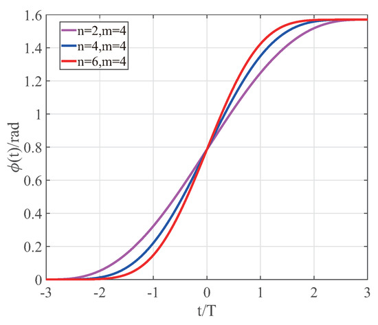 For the specific case of and , only the coefficients and Lagrange constant of the Fourier series are unknown in the mathematical generic function and the solution for signal can be found by solving the coefficients of the Fourier series. The values obtained by MATLAB simulation are substituted into Equations (10) and (11) to obtain the required optimal baseband symbol signal, taking a symbol length of 2T as an example to solve the phase modulation function. After finding the optimal baseband symbol signal function using , the coefficient K is obtained. Thereby obtaining a frequency modulation function . Then, according to , the phase modulation function can be extracted. A generic function model parameter n = 4 is selected here and the frequency modulation functions at different lengths are compared with the phase modulation function when the Fourier series m = 4. An example is shown in Table 1 based on the MATLAB software solution for a spectrogram of the phase modulation function when the Fourier series m = 4 and n = 2, 4 and 6.