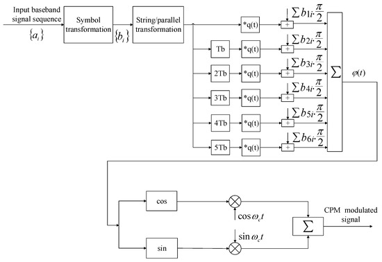 As digital communication technology has advanced, digital modulation and demodulation technologies have also developed rapidly. Continuous phase modulation (CPM) has gained increasing attention as an attractive method of communication modulation, due to having smaller out-of-band radiation, stronger anti-interference ability and higher spectrum utilization than traditional modulation methods [1,2,3]. Conventional minimum shift keying (MSK) signals and other baseband transmission signals usually have phase trajectories that are segment-linear-continuous, while their first-order derivatives or high-order derivatives are not continuous. As a result, there are large side lobes in the frequency domain [4,5]. Therefore, the signal requires a larger frequency band for transmission, resulting in low spectrum utilization. The CPM method can effectively overcome this drawback. Zhanyu Yang et al., normalized the energy spectrum comparison between MSK and quadrature phase shift keying (QPSK) and they indicated that MSK has a fast rolling-off sidelobe spectrum [6]. However, the rate of MSK decline is still slower than the CPM method.