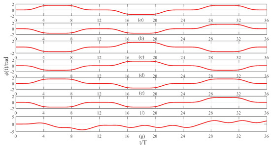 The baseband transmission symbol signal is set to {100110 010110 011001 011001 100110 110100}. After serial-to-parallel conversion, six parallel transmission signals are generated. Each channel is delayed by 1T successively in length, and six phase tracks are obtained which each contain six CPM signals. The first baseband symbol signal is {100110}, and the remaining baseband symbol signals are {010110}, {011001}, {011001}, {100110} and {110100}. A corresponding CPM phase trajectory map and phase trajectory are obtained by superimposing the signals with six parallel transmission signals, as shown in Figure 8 where (a)–(f) are the six-way parallel transmission CPM phase trajectories and (g) is the phase trajectory obtained by superimposing the six-way parallel transmission CPM signals.