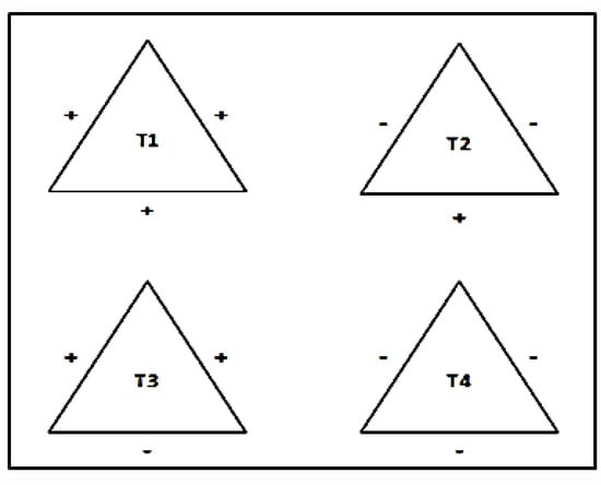 The two fundamental theories of balance theory and status theory are often used in representing the social networks. The social psychologist Heider [] formulated balance theory, which fundamentally revolves around how people tend to maintain consistency in patterns of their liking and disliking of each another and of impersonal objects. Balance theory focus on two types of triads: balanced triads and unbalanced triads (see Figure 1 and Figure 2). These triads are formed by two types of relations, unit relation, and sentiment relation. The unit relationship is the relationship between two or three individuals while the sentiment relationship refers to social objects such as trust [].