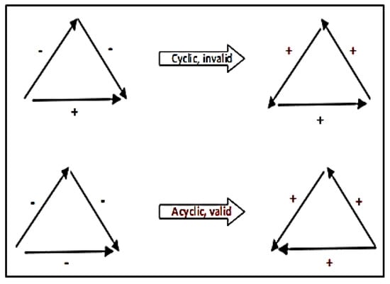 Status theory is also a popular theory from social psychology; it was implicit in the work of [] and later developed further by [,]. Status is a theory of signed link formation based on the implicit ordering of the nodes. In this theory, a positive link from A to B indicates that A thinks that B has higher status than A. Similarly, a negative link from A to B means that A thinks that B has a lower status than A. For a particular triad, status theory suggests that if each negative relation is taken, its direction reversed and its sign flipped to positive, then the resulting triangle (with all positive edge signs) should be acyclic (non-cycle) []. As shown in Figure 2, the acyclic cycle generated from the condition is a valid status theory triad. The computational trust model proposed by [] integrates three aspects of trust including basic trust, situational trust, and general trust. Basic trust is known as disposition trust, which is calculated from all the experiences accumulated by an individual. General trust is trust of another individual. Situation trust indicates the amount of trust that individual has in another taking into account a specific situation. The Marsh trust model is a computational model that focuses on trust dynamics. The trust values are calculated by using a formula or equation. These trust values are used to help individuals to identify whether another individual is trustable.