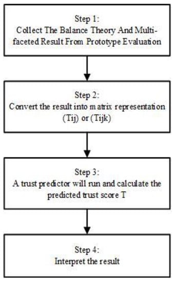 Figure 4 represents some steps taken to test and further prove Hypothesis 2. To prove the second hypothesis, a framework was developed by using the result collected from the prototype in Section 5. Another experiment was developed by using trust propagation [] as discussed in Section 2 earlier. The following sets were used for this experiment.