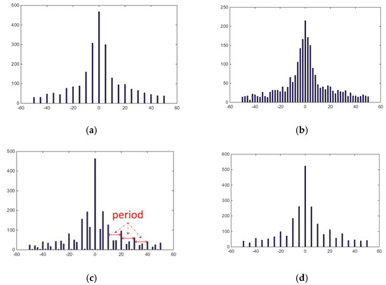 Obviously, N(Cd) is a period function with a period /gcd(, ), where gcd(, ) means the greatest common divider of and . Figure 2 illustrates an example of DQ artifact. It is obvious that all the histograms are approximately symmetric. Figure 2a,b are the histograms of single quantized histogram at frequency (2, 2) of an uncompressed image with QF = 80 and QF = 90, respectively. Figure 2c presents the double quantized histogram with QF1 = 80 and QF2 = 90 while Figure 2d shows the double quantized histogram with QF1 = 90 and QF2 = 80. Here, QF is short for the quality factor during JPEG compression. The higher the QF is, the smaller the image loss is. From Figure 2c we can find that when an image is under double JPEG compression with QF1 < QF2, the double quantized DCT coefficient histogram can exhibit some periodic pattern of peaks and valleys, which is known as the DQ artifact [15]. The period of this histogram can be calculated as gcd(, ) as mentioned above. In comparison, when QF1 > QF2, although the DCT coefficient histogram can represent periodic fluctuation, it is difficult to be detected as the distribution of the bins in this situation is very similar to the distribution of the bins of single compression (Figure 2a,d).