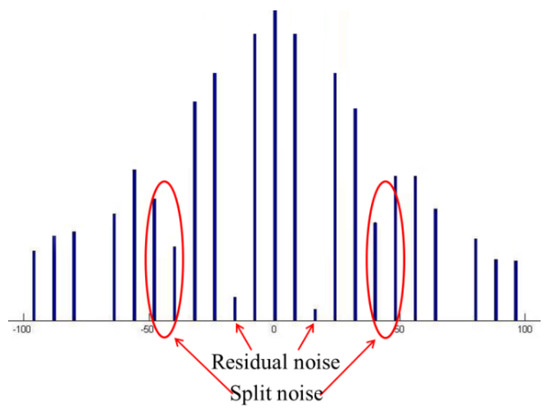 where e stands for the total noise introduced by truncation error and rounding error. Generally, according to [24], e comprises two kinds of noise, i.e., residual noise and split noise, as shown in Figure 5. The residual noise is usually very small. In contrast, the split noise is relative large and can decrease the detection performance significantly. This kind of noise appears when a bin of the first quantization (in position ) falls exactly halfway between two neighboring bins in position and as: