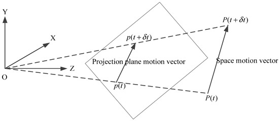 Optical flow describes the movement of a space object on the image at two-dimensional motion. As shown in Figure 1, O is the optical center of the camera, and the camera coordinate system is OXYZ. Setting P as an object point in three-dimensional space, at time t, (X1, Y1, Z1) is the coordinates of P in OXYZ. At time , P moves to , and then the image projection point of image plane is , which the corresponding image coordinate is , and the grayscale is . So when P moves from coordinate (X1, Y1, Z1) to coordinate in three-dimensional space, p moves from coordinate (x, y) to coordinate in two-dimensional image plane, as shown in Figure 1.