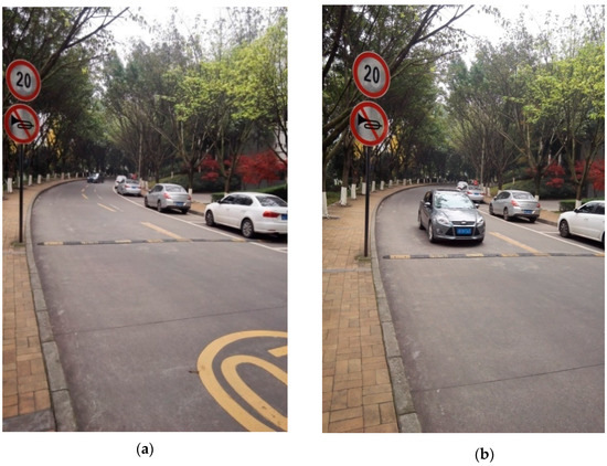 Vehicle motion images. (a) The first frame. (b) The last frame.