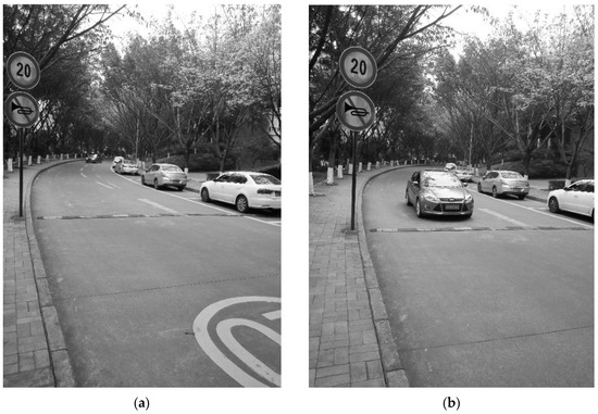 In order to estimate the motion of the target based on FDRIG optical flow, we used a tripod fixed mobile phone to shoot images. The height of the tripod is 150 cm, and the mobile phone brand is Huawei Honor 6 Plus. The section for the experiment is 150 m from the exit of a tunnel named Shijimen on the campus of a university. A moving target is tracked by computing FDRIG optical of sequences images of the silver color vehicle motion with speed is 20 km/h. The time interval of the sequence images is 1 second, and the experimental sequence images are 30 frames. Sequential images were acquired at 10:00 A.M, 21 May 2018. Figure 2a,b are the first and last frame images of vehicle motion, respectively. The experimental computer was the Vostro 3900-R6308 Dell desktop. The programming environment was Windows 7 and the programming language was Halcon. Figure 3a,b are gray images of the first frame and the last frame of the vehicle motion using Matlab software. In the sequential images of vehicle motion, the background has both trees and roads, street signs, and other static or moving vehicles with complex background. So the experiment tested vehicle moving tracking with a complex background, which can effectively verify the proposed FDRIG optical flow.