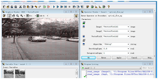 Halcon software has good performance for machine vision. Researchers can utilize Halcon software for secondary development, precision measurement, 3D camera calibration, barcode recognition, visual inspection, etc. [25,26]. Based on the further development of Halcon and setting the parameters to track the vehicles in the experiment, this paper completed the moving target tracking based on FDRIG optical flow algorithm.