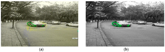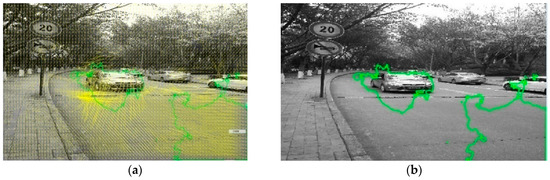 Figure 7a,b are the optical flow fields calculated by the FDRIG algorithm proposed in this paper. It can be seen that the optical flow field was concentrated around the front of the vehicle, and the optical flow motion region was integrated enveloping the vehicle. In addition, the tracking precision of vehicle motion is better than HS or LK algorithm. Accordingly, it is proved that the FDRIG optical flow can accurately trace moving vehicle with a certain speed and complex background in the natural environment.