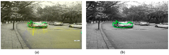 It can be seen from the comparison of the above several optical flow fields that range of the estimated optical flow field of the vehicle motion by HS algorithm is too large. The optical flow field not only contains the vehicle motion tracking, but also the road in front of the vehicle. Two optical flow fields were formed, as shown by the yellow color concentrated part in Figure 5a, and in the green area of Figure 5b. There are some difficulties in estimating the moving target of complex background images. On the contrary, the area where the two optical flow field estimated by the LK algorithm in Figure 6a,b are very small, and the first optical flow field is located in the left window and the tire area of the vehicle, and the second optical flow field is about 10 cm from the right edge of the license plate. Moreover, the two optical flows are too intermittent to completely track vehicle motion. So the experiment explains that LK algorithm is not suitable for clear and perfect tracking of vehicles with a certain speed and large motion and it is not fit for tracking targets in complex scenes with noise.