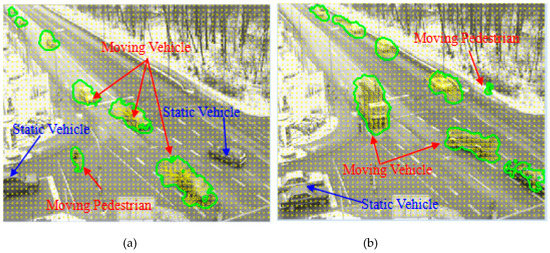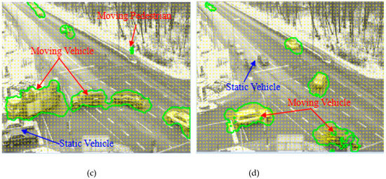 Results of Figure 8 indicate that tracking vehicle motion by FDRIG optical flow is very clear and there is no image artifact when tracking interleaved and complex vehicles in all frames of images. In Figure 8a, the movement state of the pedestrian crossing the road is clearly tracked when the traffic light turns green, and the walking state of the pedestrian on the sidewalk is also preferably displayed in the optical flow field in Figure 8b,c. In addition, the boundary of four frame images selected from 50-frame traffic scene images are relatively sharp and clear. The waiting vehicles were not tracked by FDRIG optical flow, which indicates that these vehicles were static when the traffic lights turned red. In contrast, vehicles and pedestrians in motion can be tracked and identified by optical flow, marked as moving state. So it can be verified from four frame images that FDRIG optical flow algorithm can directly segment and recognize moving image quickly and accurately through threshold settings.
