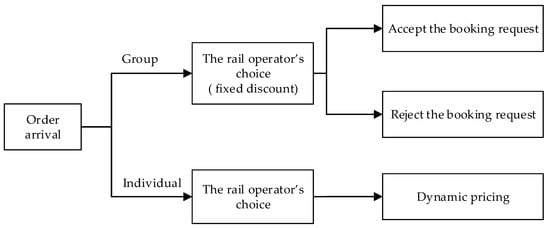 There is a train with second-class seats running between 2 stations. Because of the large volume of second-class seats, they are more appropriate for group booking and joint decision making. Here we studied a single-leg problem, so the number of tickets is equal to the number of seats. Tickets are sold before the train departs. Let the presale period be T. In order to improve revenue, the operator provides discount tickets for groups and applies dynamic pricing for individuals. Here we define that a group should include at least 20 passengers, which is in line with the regulations of the China Railway Corporation. Actually, the following proposed model can be adjusted for groups of any size based on the number of passengers. Therefore, arrival orders can be divided into 2 types: Group and individual orders. For group orders, operators provide a fixed discounts and limit the booking according to the number of tickets sold. For individual orders, operators decide on ticket prices dynamically and passengers buy tickets with a certain probability. The control process is shown in Figure 1.