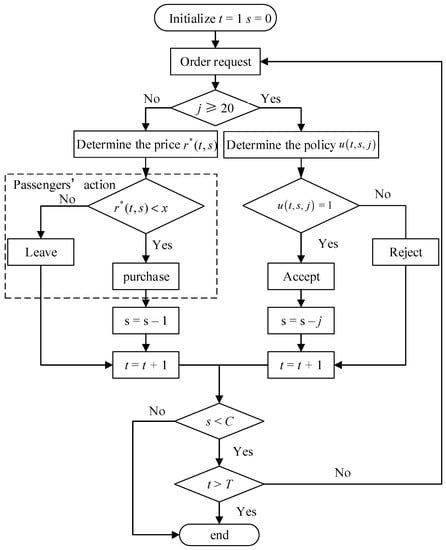 According to the above discussion, the rail operator can obtain the joint decision of group booking limits and the optimal price for individual passengers, based on the demand forecast. In the operation, the rail operator could apply the joint policy following the application process shown in Figure 2. At the beginning of , for any (number of passengers in arriving order), the rail operator can obtain and , where is solved by Equation (8) or by one-dimensional search, can be obtained by Equation (10). If an individual order arrives, the rail operator will provide price ; if a group order arrives, the rail operator makes a decision according to . If , the rail operator accepts the group order; otherwise, the group order will be rejected.