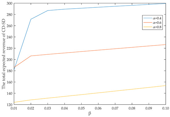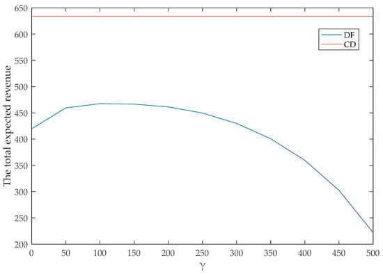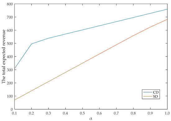 When changes from 0.1 to 1, the expected total revenues of CD and SD change, as shown in Figure 3. It is shown that the expected revenue of CD is higher than that of SD, but with an increased order arrival probability, the gap between CD and SD gradually narrows. Thus, we changed to be among 100, 200, and 300 and kept other parameters unchanged. The total expected revenues of CD and SD are shown in Table 1. The values in bold in Table 1 indicate that SD is superior to CD. In order to obtain the superior threshold of CD, we defined the individual demand–supply ratio . By changing T to change and keeping other parameters unchanged, we obtained the expected total revenue from the experiment, as shown in Table 2. When the individual demand–supply ratio reaches or exceeds 6.0, the expected revenue of SD is a little higher than that of DC. This is because the group discount is set lower than the individual price. Although the mechanism of CD allows a dynamic adjustment threshold for group orders, when individual demand is high enough, the benefit for not setting up group discounts is greater. However, when the individual demand–supply ratio is less than 6.0, group ticket discounts can effectively stimulate group demand and increase overall revenue.