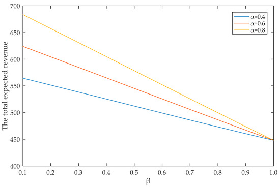 Keeping the other parameters unchanged, we simulated the expected returns under different and , and got the results shown in Table 4 and Figure 6. It can be seen that with increased under the same , the total expected return decreases. This is because group discounts are lower than individual prices. Specifically, the higher the proportion of group demand, the smaller the expected revenue. When the proportion of group demand is small, railway companies use pricing to guide more individual demand to maximize revenue.