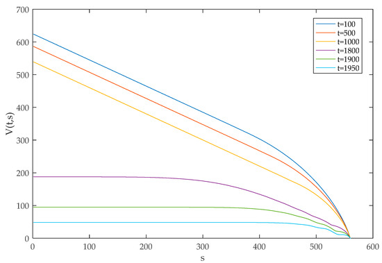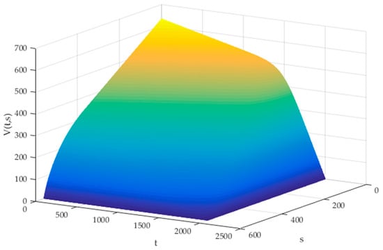 The variation of with and is shown in Figure 7. When the value of is fixed, the expected revenue decreases as the value of increases. Thus, the nearer the departure time, the lower the expected revenue of remaining tickets for the railway company. The impact of on is also shown in Figure 8. For most time periods, when the value of is fixed, the expected revenue decreases with increased , and the marginal benefit of tickets increases as the number of tickets sold increases. However, when the presale comes to the end, the expected revenue of the railway company is not the decreasing convex function of .