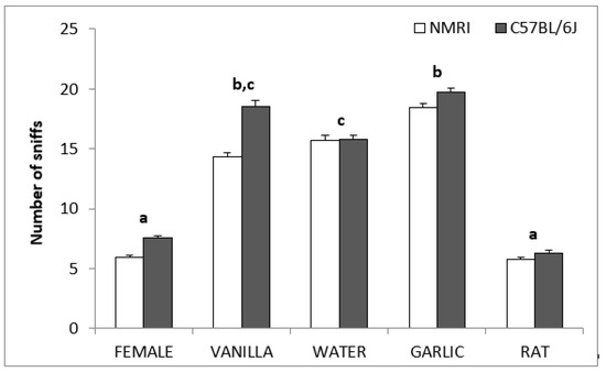 The mean number of sniffs during a session was significantly different between odours, but not between strains, and no interaction was observed (two-ways ANOVA: odours: F = 40.36, p < 0.001, ges = 0.40); strains: F = 1.43, p = 0.24, ges = 0.01; odours/strains: F = 0.73, p = 0.57, ges = 0.01; (Figure 3). Pairwise comparisons showed that the number of sniffs was lower during female and rat odour sessions compared to the other odour sessions (female or rat, compared to vanilla, water, or garlic: all pairwise comparisons: p < 0.001), but not different between female and rat odour sessions (female/rat: p = 0.27). The mean number of sniffs during water sessions was not different in comparison with vanilla odour sessions (p = 0.68) but was lower compared to garlic odour sessions (p = 0.02). The number of sniffs during vanilla and garlic odour sessions was not different (p = 0.13).