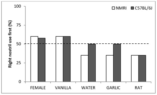 We found no nostril-use preference at the group level at the beginning of a session, whatever the strain or the odour (binomial tests: NMRI: female and vanilla: p = 0.50; water, garlic, rat: p = 0.26; C57BL/6J: female: p = 0.82; vanilla: p = 0.50; water, garlic: p = 1; rat: p = 0.26; Figure 4). The first nostril used was not significantly different according to the odour whatever the strain considered (Cochran test: NMRI: Q = 6.25, df = 4, p = 0.18; CR7BL/6J: Q = 3.82, df = 4, p = 0.43).