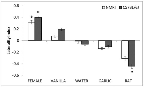 Laterality indexes (mean ± s.e.m) obtained for each odour in the two mice strains tested. One-sample t-tests: *: p < 0.05.