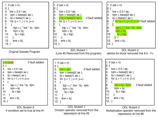 - Deng, L.; Offutt, J.; Li, N. Empirical evaluation of the statement deletion mutation operator. In Proceedings of the 2013 IEEE Sixth International Conference on Software Testing, Verification and Validation, Luxembourg, 18–20 March 2013; IEEE Computer Society: Washington, DC, USA, 2013; pp. 84–93. [Google Scholar]