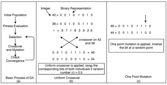 Figure 3. Basics of GA (a) basic process, (b) uniform crossover, and (c) mutation.
