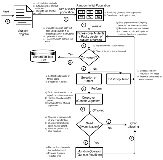 - GA and its Operators: GA is an evolutionary algorithm based on the concept of natural genetics of reproduction [6,7,8]. In an iteration of execution, it starts with the random initial population P, fitness evaluation of P, selection, reproduction (crossover and mutation) and stops re-iterating when an optimal solution is found (Figure 3). Each individual in the population is represented as chromosome (a sequence of genes) and encoded in binary for a binary-encoded GA, which is used in this study. For the evolution of individuals, crossover combines two individuals and produces two new individuals (offspring); on the other hand, mutation flips a bit in the gene of a chromosome [67]. In this work, a population of GA is mapped to the set of test cases, and the chromosome is mapped to the concatenated value of test inputs.