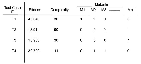As shown in Algorithm 1, our approach tdgen_gamt creates a random solution of test inputs, i.e., , which is initially empty. In this paper, each test input can have its value in the range . Here, we use a binary-coded Genetic Algorithm and perform crossover and mutation on the binary string. Therefore, the integer test inputs are converted in binary using (8× number of inputs) bits for reproduction (8 bits are sufficient to represent each test input in the range ). There are variants for chromosomes encoding in GA e.g., gray, binary and, real, and each has its own advantages and disadvantages [68,69,70]. Binary encoding is beneficial to include a sudden change in the population of solutions, which is desirable in the current study to diversify the population for increasing the chances of detecting live mutants. We evaluate the quality of the test suite by executing it against the mutants (each test case is executed over each mutant in the set) (Section 2.2.1), and the fitness of each test case is recorded in the fault matrix (Figure 5). For example, we have n number of mutants () and 4 test cases uniquely identified by test case IDs (). Each test case has its own fitness, complexity, and mutant detection information in the form of 0 and 1 which in turn express live and killed mutant, respectively.