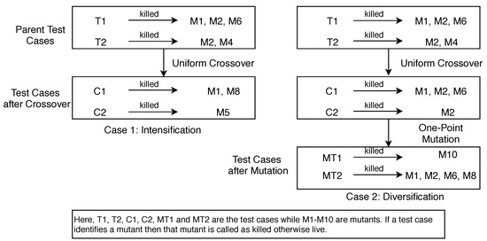 Let we have two test cases , with their killed mutants (, , ) and (, ) respectively. Consider case 1, parent test cases , are improved via intensification (crossover); however, offspring from crossover (, ) is not more effective than parent test case, but , kill live mutant and respectively. It makes and valuable in the entire population. Meanwhile in case 2, and do not enhance the effectiveness of the complete test suite, therefore , are diversified using mutation. This may produce effective test cases.