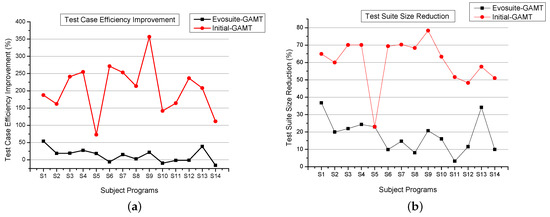 The results by taking only the average mutation score into consideration show that Evosuite tests (With greater test size than our proposed mechanism) outperform the other two by 9% (our approach) and 17% (Initial Random Tests) referring all traditional mutants. Evosuite needs on average 12 test cases to identify 96.35% traditional mutants while our approach requires only 10 test cases to kill 87.83% traditional mutants. As stated in [88], a technique is recognized more effective when it generates tests, killing more faults using an equal size test suite. Considering the size of the test suite along with mutation score, we also analyze the effectiveness of each approach and named it as test case efficiency () (Equation (2)). The discussion related to is given in Section 4.3. Overall, out of 2993 executable traditional mutants, Evosuite could detect 2884 mutants, tdgen_gamt could kill 2629 mutants while Initial Random tests killed only 2383 mutants. For some of the programs (S8, S9, S10), Initial tests could detect more traditional mutants than tdgen_gamt. For such cases, removing redundant tests found to be harmful. As a test case is redundant for a mutant set but may be non-redundant for some other mutant set. Therefore, Initial tests perform better for traditional mutants for S8–S10. On the other hand, tdgen_gamt could achieve high fault exposure when considering SDL, ODL faults.