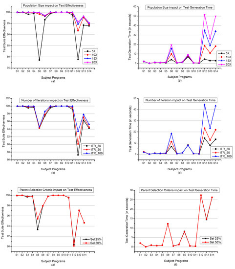 Mutants are widely accepted and simulated artificial faults that behave similarly to realistic ones [11,12] for test data generation [9,13]. These are created by systematic injection of faults using predefined mutation operators [14]. Mutation testing was initially suggested by DeMillo [15] and later explored by different researchers [16,17,18]. Execution of a test case (test inputs) against these faults results in the adequacy score of that test case. This score is also known as mutation score (%), which is measured using the killed mutants (covered faults, KM) and the total non-equivalent mutants (M) and is expressed as []. However, some of the mutants are not recognized by any of the test cases because they do not differ from the original program. Therefore, such mutants are referred to as equivalent and adversely impact the test suite performance [19,20]. The problem of identification of equivalent mutants has also been addressed in prior studies [21,22,23]. Apart from the several benefits including a reduction in the search space and providing the framework for test suite quality assessment, mutation testing also suffers from a high computational cost. However, in the last few decades, researchers have tried to minimize this cost by using various techniques which usually follow do-fewer, do-smarter, or do-faster kinds of strategies [17,18,24,25,26,27,28,29,30,31,32,33] and more studies can be traced in a recent survey [34]. Selective mutation, which is used in the current study, is one of these approaches that generate mutants by applying some operators from the large set of mutation operators [14] (Section 2.1).