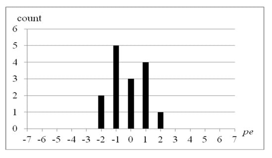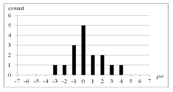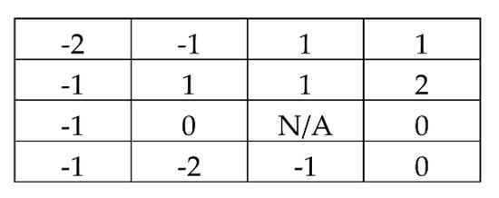 An example of block-based prediction for the 4 × 4 image block by using BPRHS with pno = 2 is described as below. The position diagram of the pixels is given in Figure 1a. In BPRHS, p10 is taken as the reference pixel. The test image block of 4 × 4 pixels is listed in Figure 1b. A total of 15 prediction errors of the test block using BPRHS are shown in Figure 1c. Since there is no prediction error for the center pixel p10, the corresponding prediction error of p10 is marked as not available (N/A). The resultant residual image histogram of BPRHS is shown in Figure 2. Two pairs of peak and zero points (0,−4) and (2,5) are searched from this residual image histogram. These two pairs of peak and zero points are used in the residual histogram shifting process to embed the secret data. The hiding capacity of the BPRHS is 7 bits when the pno value is set to 2.