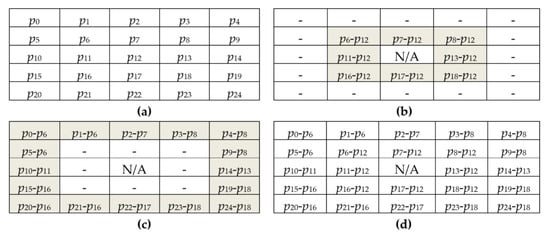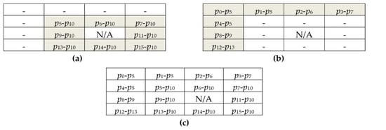 The above process is also called the first prediction model. Figure 3 depicts the first prediction model for 4 × 4 blocks. Here, the center pixel p10 is taken as the reference pixel of the image block. In the first round of prediction, eight prediction errors shown in Figure 3a of these directly adjacent pixels to the center pixel are computed. In the second round of the prediction process, the remaining seven prediction errors are computed as shown in Figure 3b. Here, p5 is taken as the reference pixel for p0, p1, and p4. Besides, p6, p7, p9, and p13 are taken as the reference pixels for p2, p3, p8, and p12, respectively. The prediction errors of this block are shown in Figure 3c.