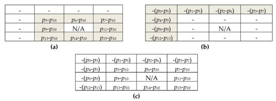 The second prediction model of the proposed technique when p10 is taken as the reference pixel for 4 × 4 image block: (a) prediction errors of directly adjacent pixels; (b) prediction errors of the others; (c) Prediction errors.