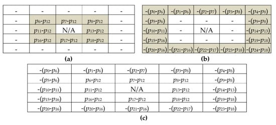The second prediction model of the proposed technique for 5 × 5 image block: (a) prediction errors of directly adjacent pixels; (b) prediction errors of the others; (c) prediction errors.