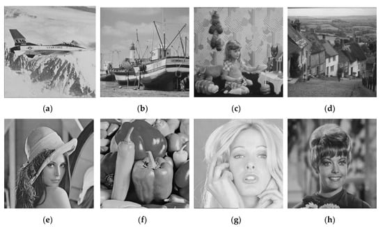 Our experiments are performed on a Window 10 computer with Intel Core i7 3.6 GHz CPU and 16 GB random access memory (RAM). The testing programs are implemented in Bloodshed Dev C++. In our experiments, eight grayscale images of 512 × 512 pixels, “Airplane”, “Boat’, “Girl”, “Goldhill”, “Lenna”, “Pepper”, “Tiffany”, and “Zelda” in Figure 9, are used. These testing images are downloaded from the USC SIPI image database.