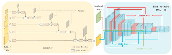 StyleGAN [20] is a GAN network for synthesizing high quality facial images. In order to generate diversity facial images, the synthetic network uses the adaptive instance normalization (AdaIN) to add a scaled display noise to the synthetic results of different scales. Inspired by styleGAN, we propose a new generator using multilevel noise encoding, as shown in Figure 2. The structure first down-samples the style image to obtain a set of down-sampled results of the same size as the feature map of loss network. Then, the explicit noise inputs of the same scale are added to create random variations. Next, the results of the different scales and convolution operations are used to obtain the noise-coded style image. In the generator, the join blocks contain three parts: up-sample, batch norm, and concat. In the convolution blocks, one round has four part: padding, convolution, regularization and rectified linear unit (ReLU). The convolution blocks contain three rounds with kernel sizes of 3 × 3, 3 × 3 and 1 × 1, respectively. The generator uses multilevel noise encoding to solve the problem of local effects on the synthesis result, while introducing diversity into the style image.