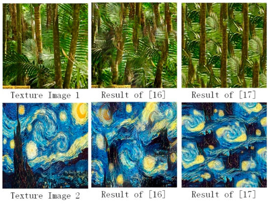 - Gatys, L.A.; Ecker, A.S.; Bethge, M. Texture Synthesis Using Convolutional Neural Networks. In Advances in Neural Information Processing Systems; MIT Press: Cambridge, MA, USA, 2015. [Google Scholar] [CrossRef][Green Version]