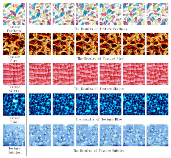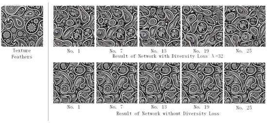 The image style transfer network of the multilevel noise encoding can realize diversity texture synthesis without adjusting the network structure (refer to Section 2.4). The effect of the diversity loss function on the diversity texture synthesis results is shown in Figure 4. The input texture image is in the left side, the texture synthesis result with diversity loss function is in the upper-right corner, the texture synthesis result without diversity loss function is in the bottom-right corner. The difference between adjacent results with diversity loss function is obvious, and the texture synthesis results are diverse.