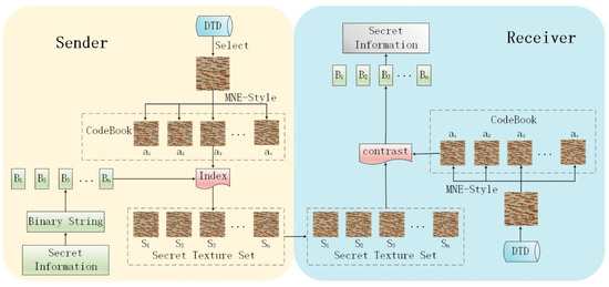 The hidden method and extraction method of secret information is the focus of steganography method. When hiding is performed, we should consider how to encode the secret-embedded cover generated by MNE-Style, and how to convert the secret texts into image. The image style transfer result generated by the image style transfer network contains not only style information but also content information. In order to reduce the amount of data that needs to be transmitted, the describable textures dataset (DTD) image dataset is selected in this study. In the image style transfer network, only the texture synthesis result is used for the coverless information hiding. As shown in the sender side of Figure 7, the specific steps of the hiding are as follows: