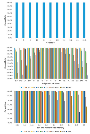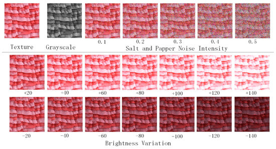 In order to make sure that a set of diversity texture images generated by the MNE-Style meet the requirements of the unsupported steganography codewords, there should be differences among different secret-embedded covers. In order to balance the texture diversity synthesis results and the robustness of steganography, the step size and robustness are balanced through experiment. Five hundred texture images are randomly selected from the DTD dataset, synthesized into the diversity texture images as codewords of coverless steganography by the MNE-Style. In order to encode the binary secret information with different lengths, the number of diversity texture synthesis is 2, 4, 8, 16, 32, 64, 128, 256, 512, 1024, 2048, respectively. The obtained diversity texture results are attacked by salt and pepper noise, brightness adjustment, and grayscale conversion with different parameters. The effects of one synthesis texture result after attack are shown in Figure 10. The relationship between the correct extraction rate and step size of diversity under attacks with different parameters is shown in Figure 11. Our method is robust to grayscale conversion, and it can maintain good robustness and encode more secret information in the cases of salt and pepper noise and brightness adjustment when step size of diversity loss is generated. The step size of diversity loss is 256. This setting remains in the experiment in the next sections.